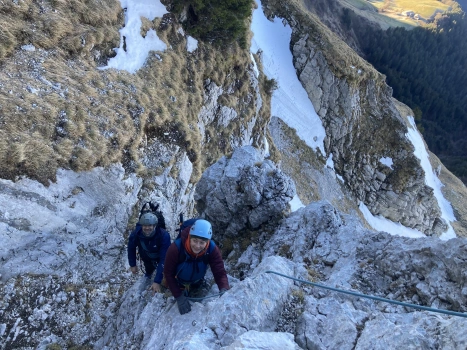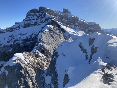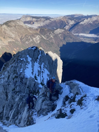 Un peu d’escalade, un rateau de chèvre, des pentes de neige, quelques passages de mixte, voilà un bel itinéraire ludique, varié, parfait dans ces conditions! Il nous offre en plus une vue incroyable sur le sommet enneigé de la Tournette…