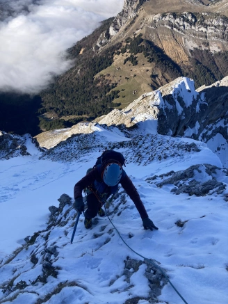 Début janvier 2023, nous ne sommes pas encore entrés au coeur de l’hiver. Tout le monde a hâte, les amateurs de poudreuse, de cascade de glace, mais aussi la faune et la flore … Mais les conditions sèches de ce mois de janvier sont aussi une opportunité à saisir pour l’alpinisme en hiver! Car oui, les conditions idéales sont rassemblées: neige tassée, beau temps, pas de neige fraîche pour éviter le brassage et les risques de coulées en plein soleil l’après-midi. Alors, Feu!!