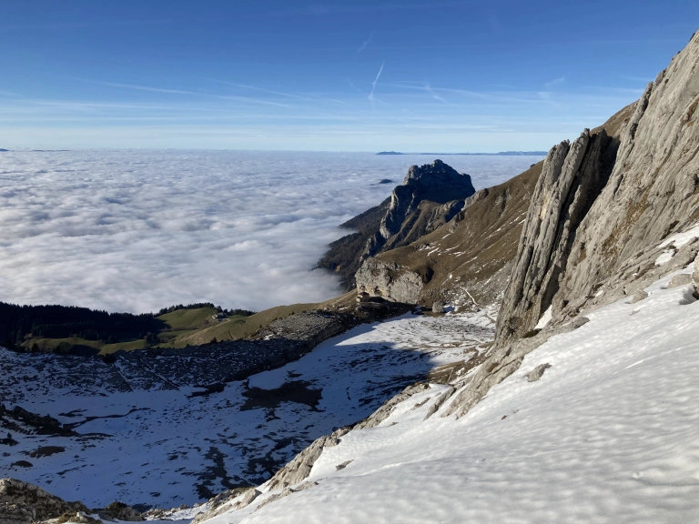 Et en cette période, le contraste est marquant. Rocher jaune baigné de soleil en versant sud, neige froide, souvent durcie par le vent côté nord.